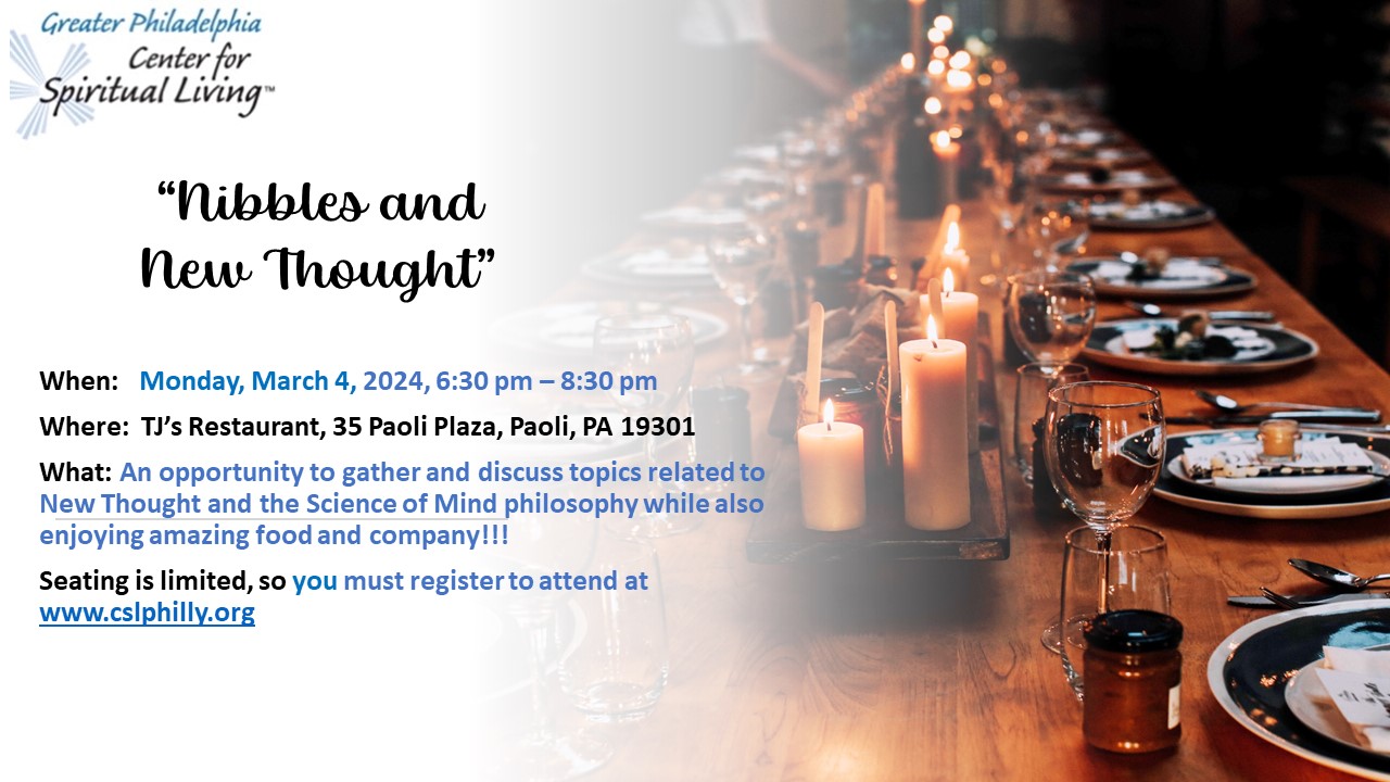 Please join us for our “Nibbles and New Thought” in-person event on Monday evening, on March 4, 2024 from 6:30 to 8:30 PM at TJ’s Restaurant located 35 Paoli Plaza, Paoli, PA 19301. We will meet for nibbles and an opportunity to discuss topics related to New Thought and the Science of Mind philosophy. There is no charge for this event; you just pay for whatever food and beverages you order.