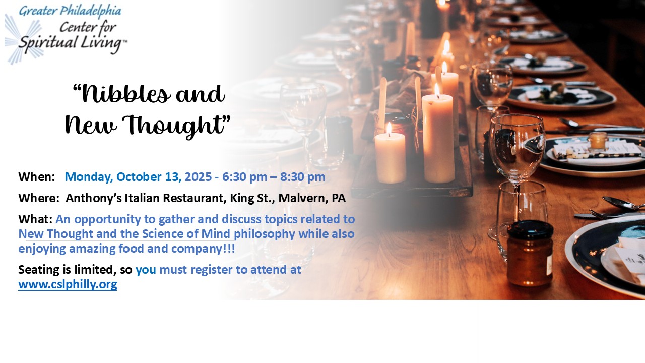 Join us for our monthly “Nibbles and New Thought” in-person event on Monday evening, on October 13th at 6:30 pm at Anthony’s Italian Restaurant, King Street, Malvern, PA. We will meet for nibbles and an opportunity to discuss topics related to New Thought and the Science of Mind philosophy.