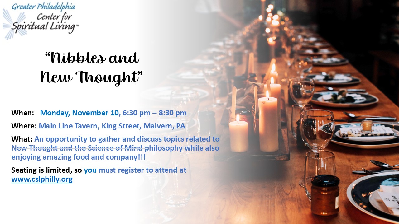 Join us for our monthly “Nibbles and New Thought” in-person event on Monday evening, on November 10th at 6:30 pm at the Main Line Tavern, 516 King Street, Malvern, PA. We will meet for nibbles and an opportunity to discuss topics related to New Thought and the Science of Mind philosophy.