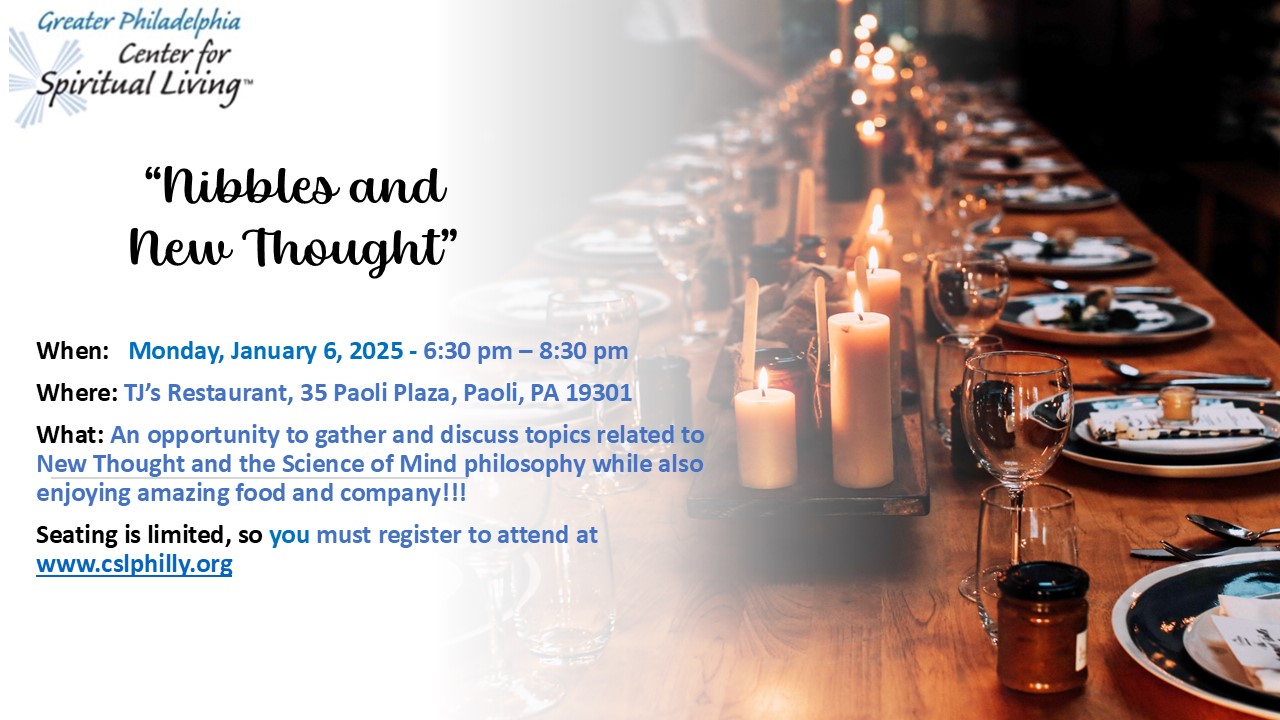 Nibbles & New Thought Gathering – Cancelled due to snow at TJ’s Restaurant, 35 Paoli Plaza, Paoli Map Unavailable Date/Time Date(s) - 01/06/20256:30 pm - 8:15 pm Cancelled due to snow.